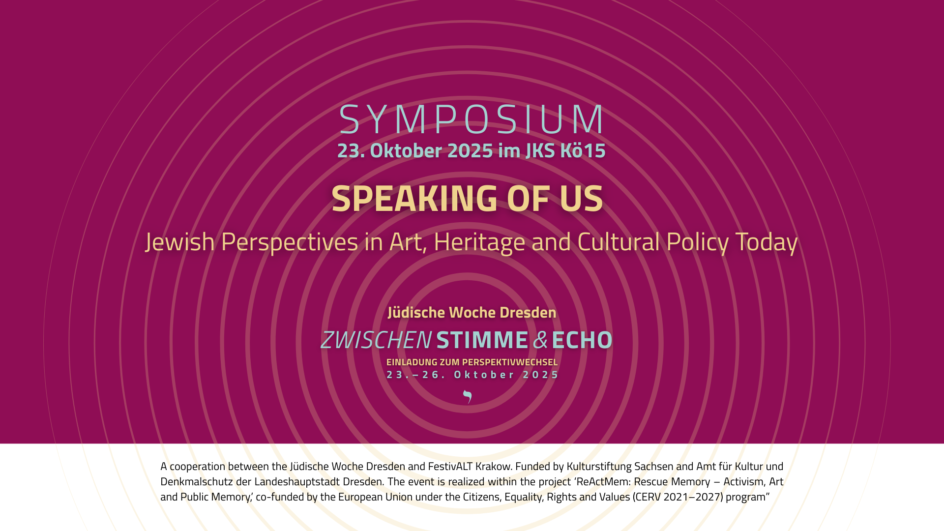 „Jüdische Perspektiven in Kunst, Erinnerungskultur und Kulturpolitik heute" Symposium in Dresden | 23. Oktober 2025 | JKS Kö15 Im heutigen Europa werden jüdische Geschichten, Kulturen und Identitäten häufig von anderen erzählt, umgedeutet oder politisch instrumentalisiert – besonders in Zeiten globaler Krisen. Wer erzählt die jüdischen Geschichten in Europa – und wie können jüdische Stimmen zu […]